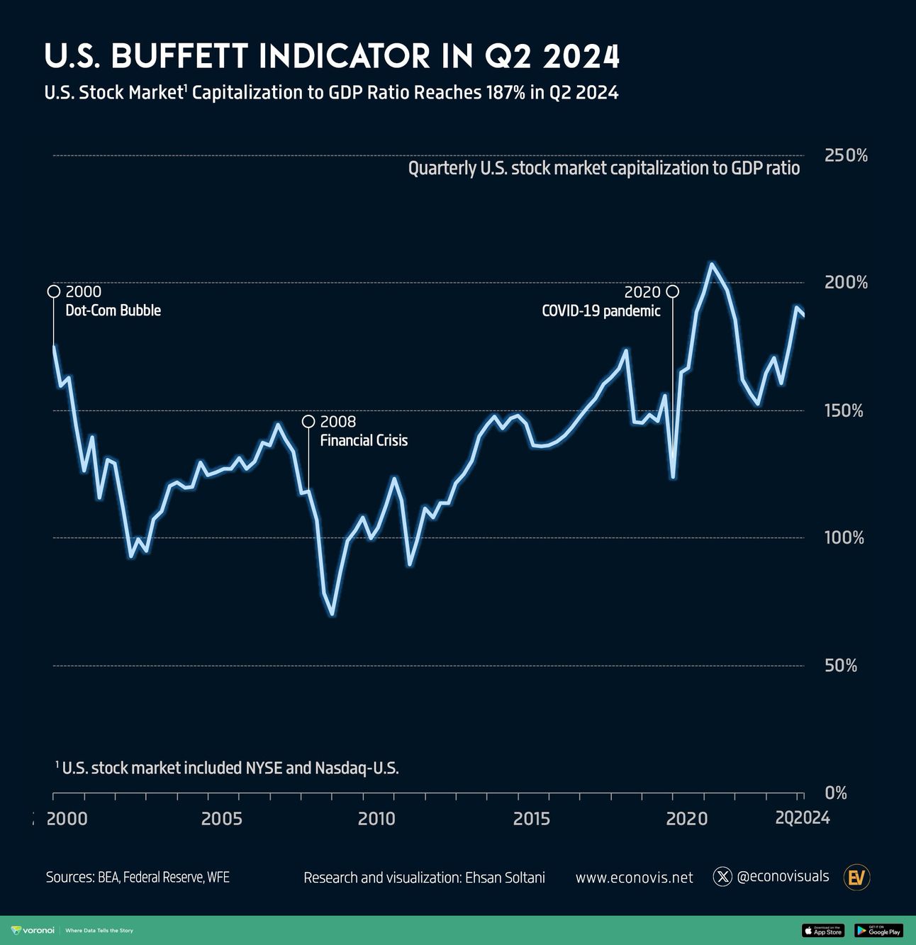 El Buffett Ratio ha alcanzado un 187% en el segundo trimestre de 2024. Esto significa que el valor total de las acciones cotizadas en EE. UU. es casi el doble del tamaño de la economía estadounidense.