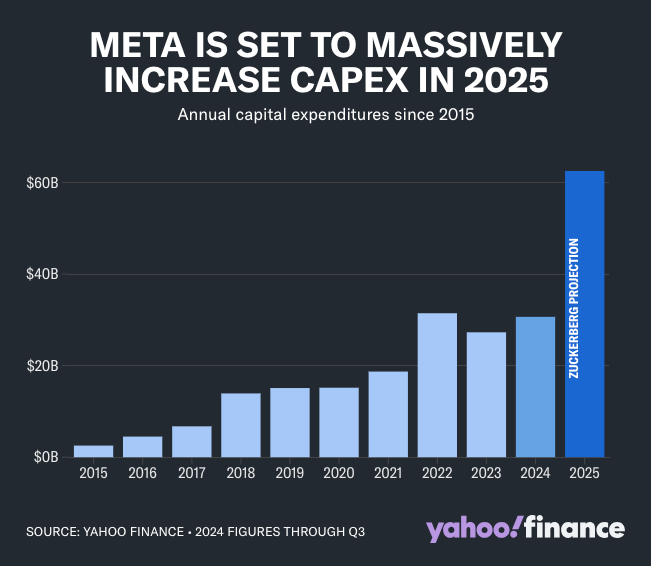 Meta, en contraste, presentó resultados sólidos con ingresos de $48.4 mil millones y un EPS de $8.02, superando las previsiones de $46.9 mil millones y $6.75, respectivamente. No obstante, la compañía anticipó un crecimiento más lento en el primer trimestre de 2025, con ingresos proyectados entre $39.5 y $41.8 mil millones, lo que representa una expansión de entre 8% y 15%, inferior al 21% del último trimestre. Además, Meta anunció un ambicioso plan de gasto en infraestructura de IA, con inversiones de hasta $65 mil millones este año. El CFO de Meta, Susan Li, advirtió que los costos operativos aumentarán a un rango de $114 mil millones-$119 mil millones en 2025, impulsados por mayor inversión en talento técnico, regulación y el desarrollo de Reality Labs. A pesar de la fuerte apuesta en IA y metaverso, el mercado reaccionó con cautela, reflejando incertidumbre sobre la rentabilidad a largo plazo de estas inversiones.